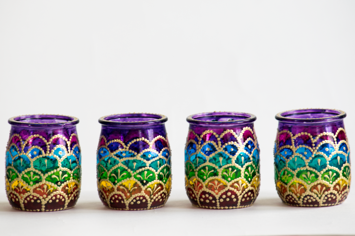 - Pomalowany farbami do szkła na kolory tęczy. Zdobiony na złoto, pokryty werniksem.