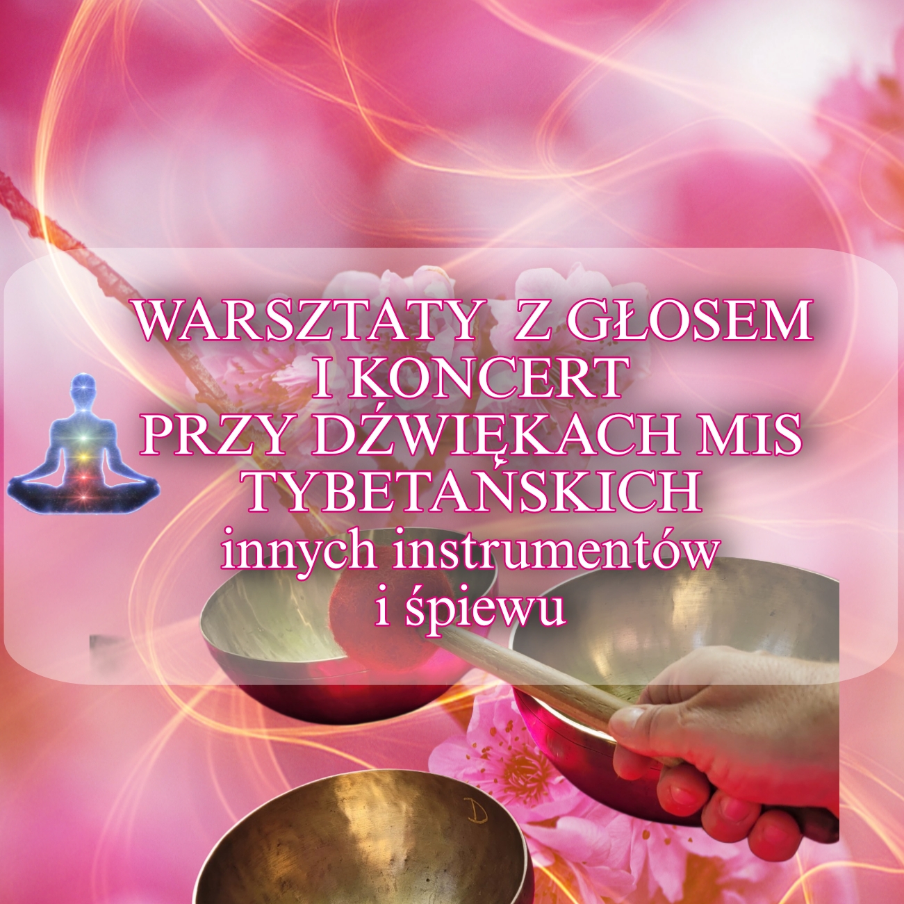 Skorzystaj z potężnej energii dźwięku swojego głosu i mis tybetańskich! Zapraszam Cię na warsztaty z głosem ( śpiewanie mantr i poruszenie nimi energii w czakrach) i relaksacyjny koncert przy dźwiękach mis tybetańskich. Niech ożywcza, odświeżająca i pulsująca energia życia, jaka jest zawarta w dźwięku rozgości się w Tobie dla Twojego dobrostanu i zdrowia i doda Ci mocy.Przyjdź na warsztaty i koncert i dostrój się do częstotliwości harmonii i balansu.
